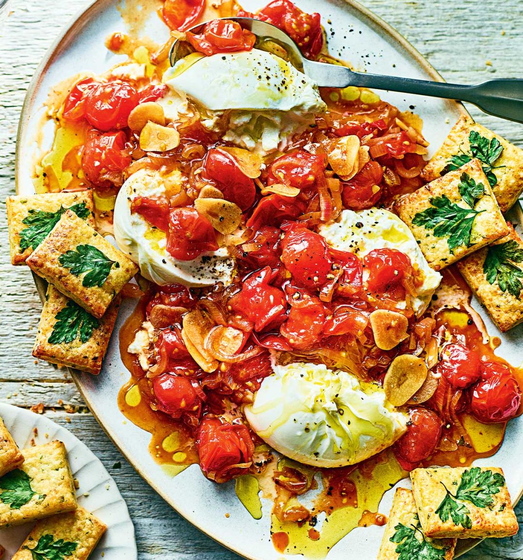 To serve, tear open the burrata, arranging it on a platter, then spoon over the tomato mixture. Finish with an extra drizzle of olive oil and some black pepper. Serve with herby pecorino crackers for scooping.