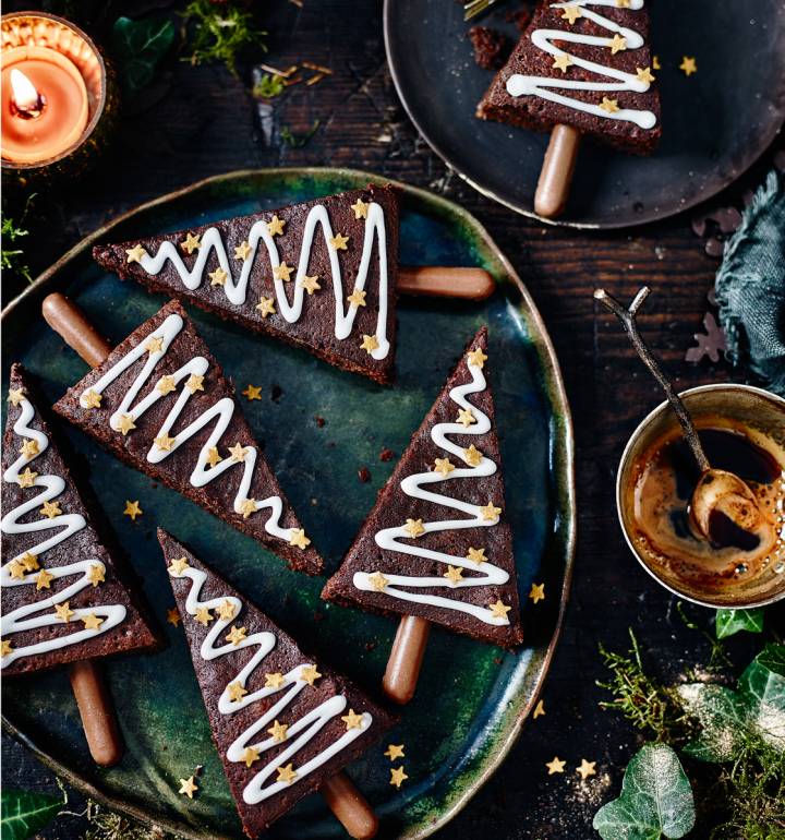 - Mix the icing sugar with 2 teaspoons of water, adding a drop or two more if needed to make a thick but runny icing. Drizzle or pipe over the brownie triangles in a zigzag pattern. Scatter with the star sprinkles and insert a chocolate finger to create a tree trunk. Leave the icing to set for at least 2 hours before serving.