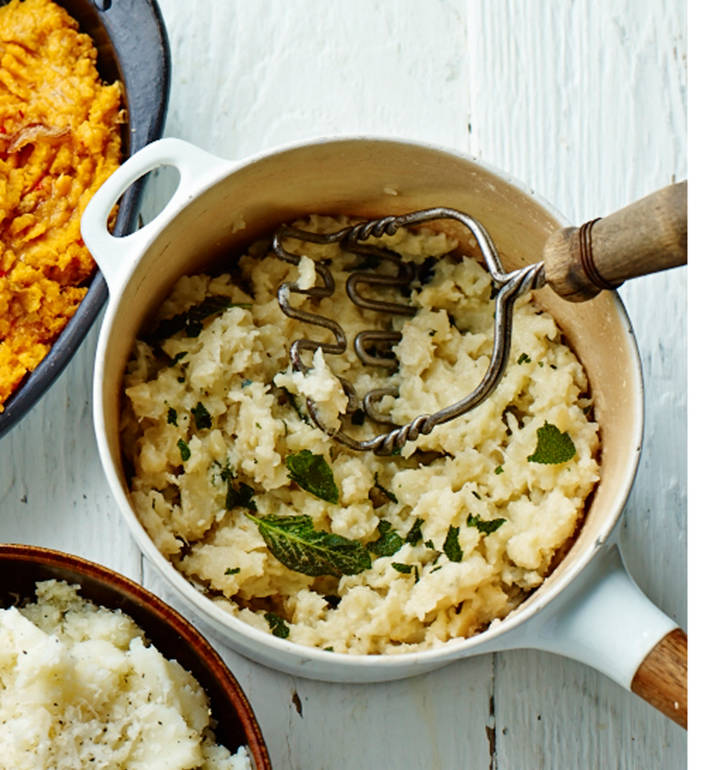 - Drain the celeriac, mash it with the 50g of butter and milk, and season. Reheat in the pan until piping hot, then add the Gorgonzola and half the sage leaves, crumbled, and stir together.